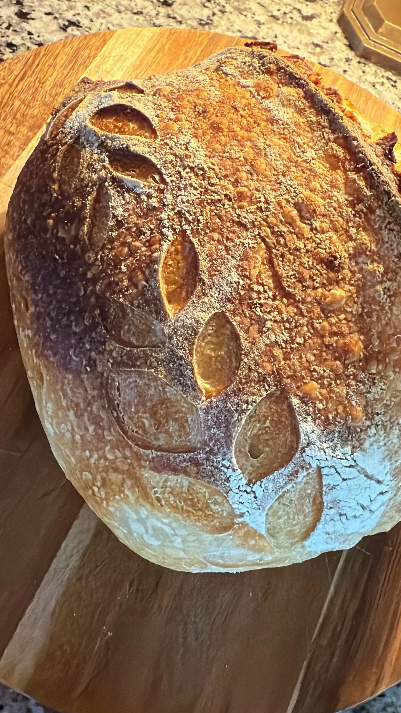 A The scoring of a sourdough loaf is performed with a lame and a razor. The shallow cuts of the loaf are made just before baking. This process allows the dough to expand and release gases.